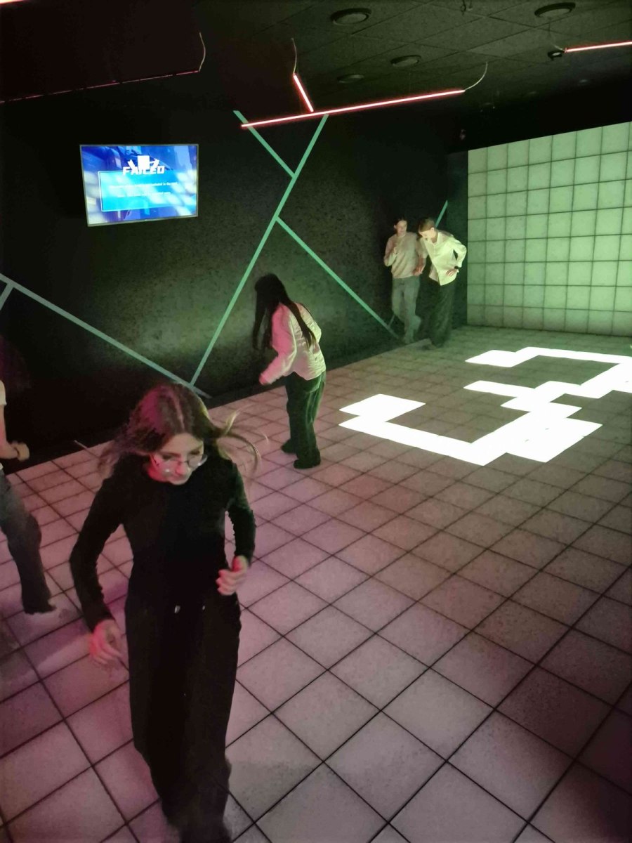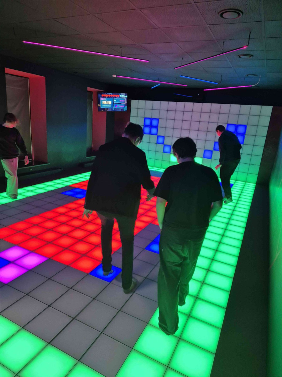 Neiztikt arī bez izklaidēm! Bijām izmēģināt interaktīvu spēli, kurā skolēnu uzdevums bija iziet dažādas grūtības pakāpes spēles līmeņus, ar rokām un kājām ķerot pikseļus uz grīdas un sienām. Apvienojām fiziskās aktivitātes ar prāta treniņu!