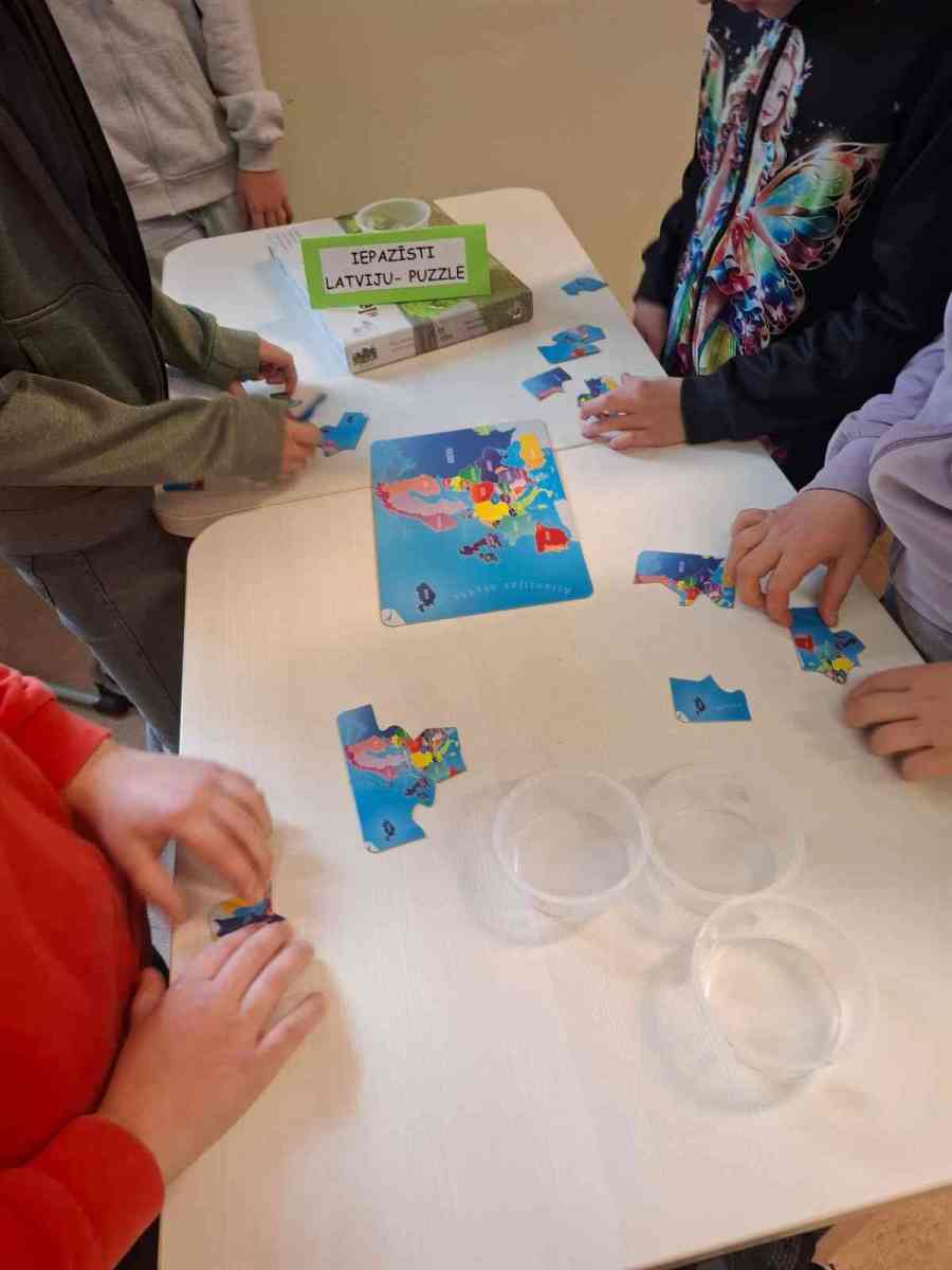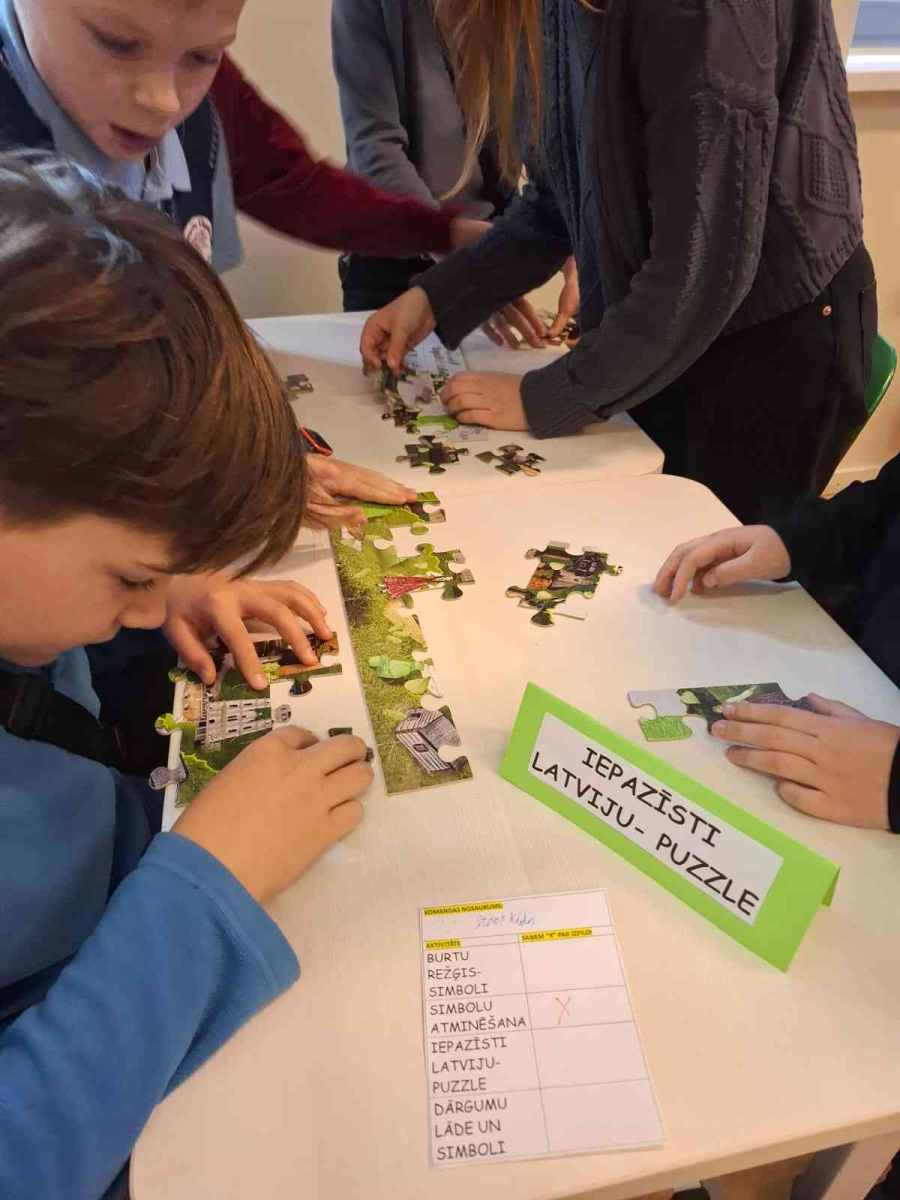 Kad skolēni ieradās pirmajā darbnīcā “Iepazīsti Latviju”, ar aizrautību un sadarbojoties kā īstiem pētniekiem, viņi salika karti un atklāja tajā paslēptos Latvijas simbolus. Katrs simbols kļuva par iemeslu mazam stāstam vai sarunai, un skolēni dalījās ar to, ko paši zina par Latviju.