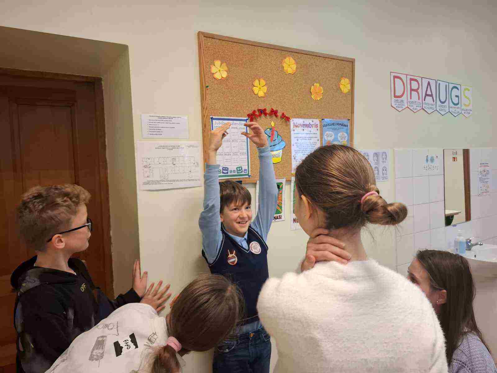 Tālāk bērni devās uz staciju, kas izrādījās dienas favorīte – “Simbolu atminēšana”. Tur viņi sadalījās divās komandās un ar lielu patiku centās attēlot dažādus Latvijas simbolus tikai ar kustībām un žestiem. Smiekli un prieks skanēja pa visu klasi, jo reizēm simbolu atpazīšana izrādījās īsts izaicinājums. Komandas cīnījās godīgi un azartiski, un katrs minējums deva jaunu enerģiju.