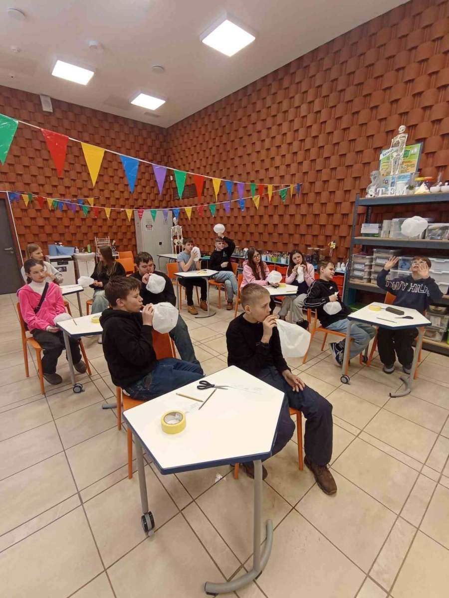 Nodarbības otrajā daļā skolēni pētīja elpošanas procesu un noteica elpošanas biežumu un plaušu tilpumu, izmantojot maisiņus un kokteiļsalmiņus.
