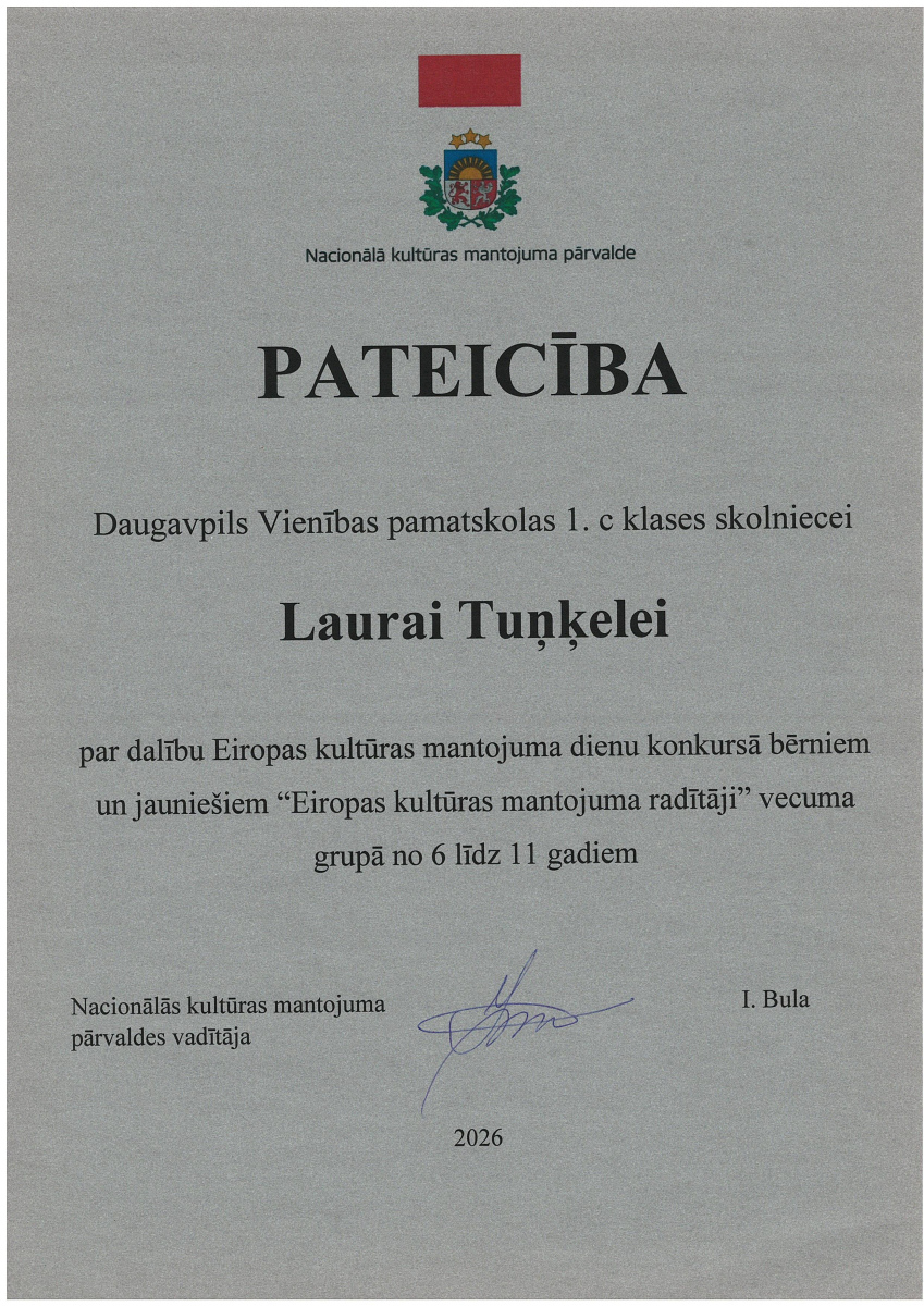 Daugavpils pilsētas izglītības, jaunatnes un sporta pārvalde Atzinības raksts Daugavpils Vienības pamatskolas skolnicei Laurai Trubiņai par panākumiem latviešu valodas un literatūras 52. valsts olimpiādes 8.-9. klašu skolēniem 2. (novada) posmā