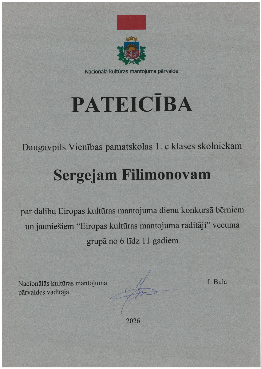 Daugavpils Pilsētas izglītības pārvalde Diploms Daugavpils Vienības pamatskolas skolniecei Margaritai Rimvidai-Mickevičai par 3. vietu Angļu valodas valsts 55. olimpiādes 2. posmā (pilsētas olimpiādē) 4.-6. klašu skolēniem