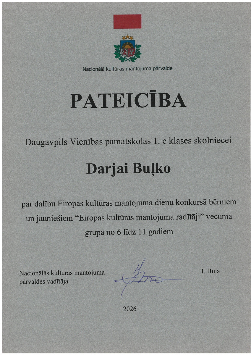 Daugavpils Pilsētas izglītības pārvalde Atzinības raksts Daugavpils Vienības pamatskolas skolniecei Patricijai Grigulei par piedalīšanos Angļu valodas valsts 55. olimpiādes 2. posmā (pilsētas olimpiādē) 4.-6. klašu skolēniem