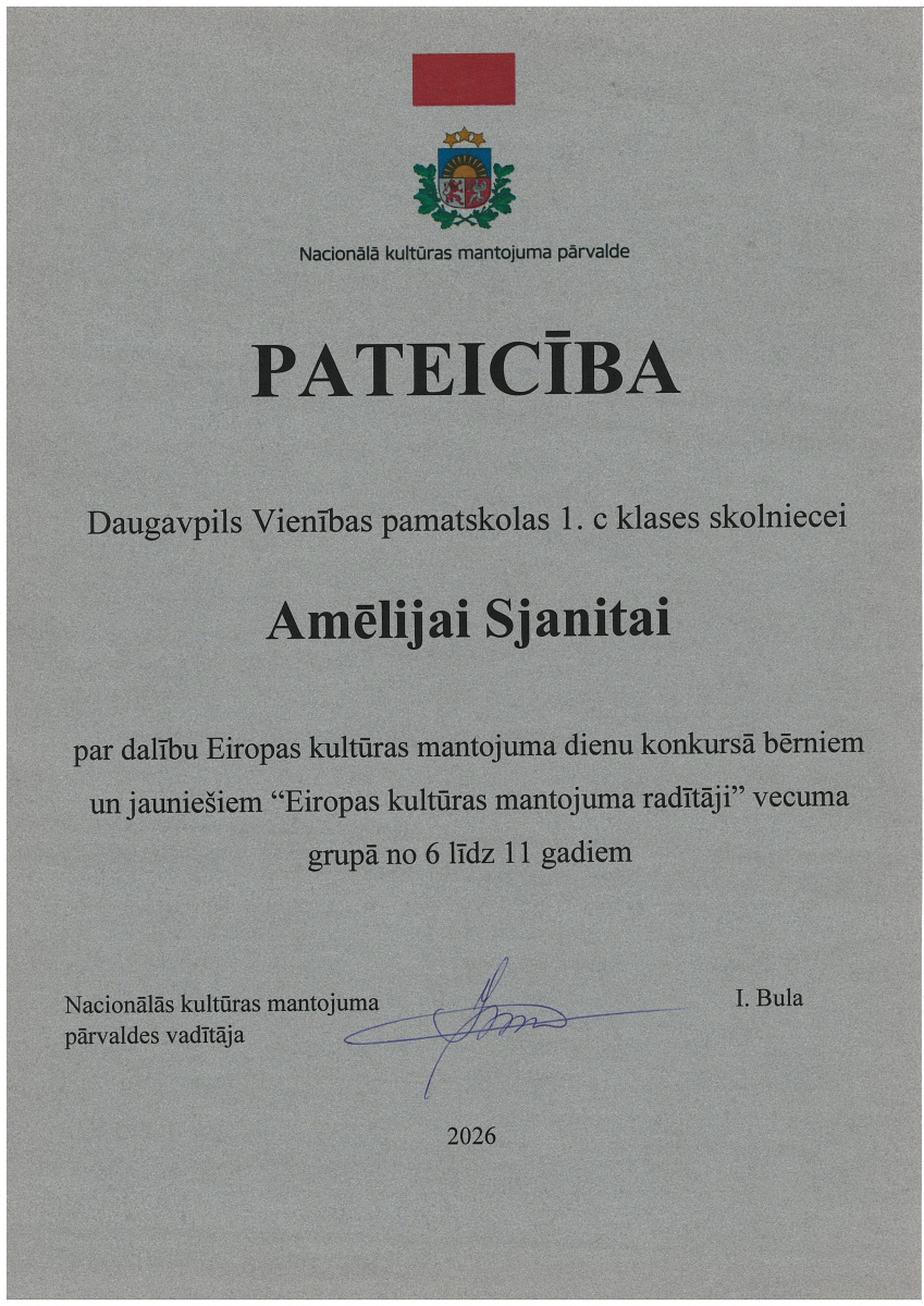 Valsts izglītības attīstības aģentūra Diploms 1. pakāpe 42.8 punkti Daugavpils Vienības pamatskolas 2. klases skolniecei Līgai Laizānei skolotāja Inna Bicāne Latvijas skolēnu skatuves runas konkursā Latgales kultūrvēsturiskajā novadā